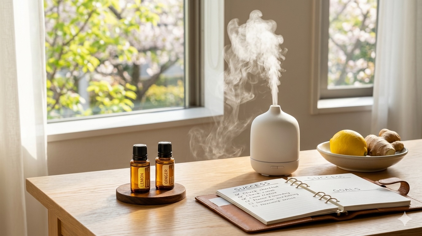 - やる気スイッチの「芳香浴」: デスクの横でレモンとジンジャーをブレンドして香らせます(レモン2:ジンジャー1の割合がおすすめ)。爽やかさの中にピリッとした力強さが加わり、作業効率がぐんと上がります。