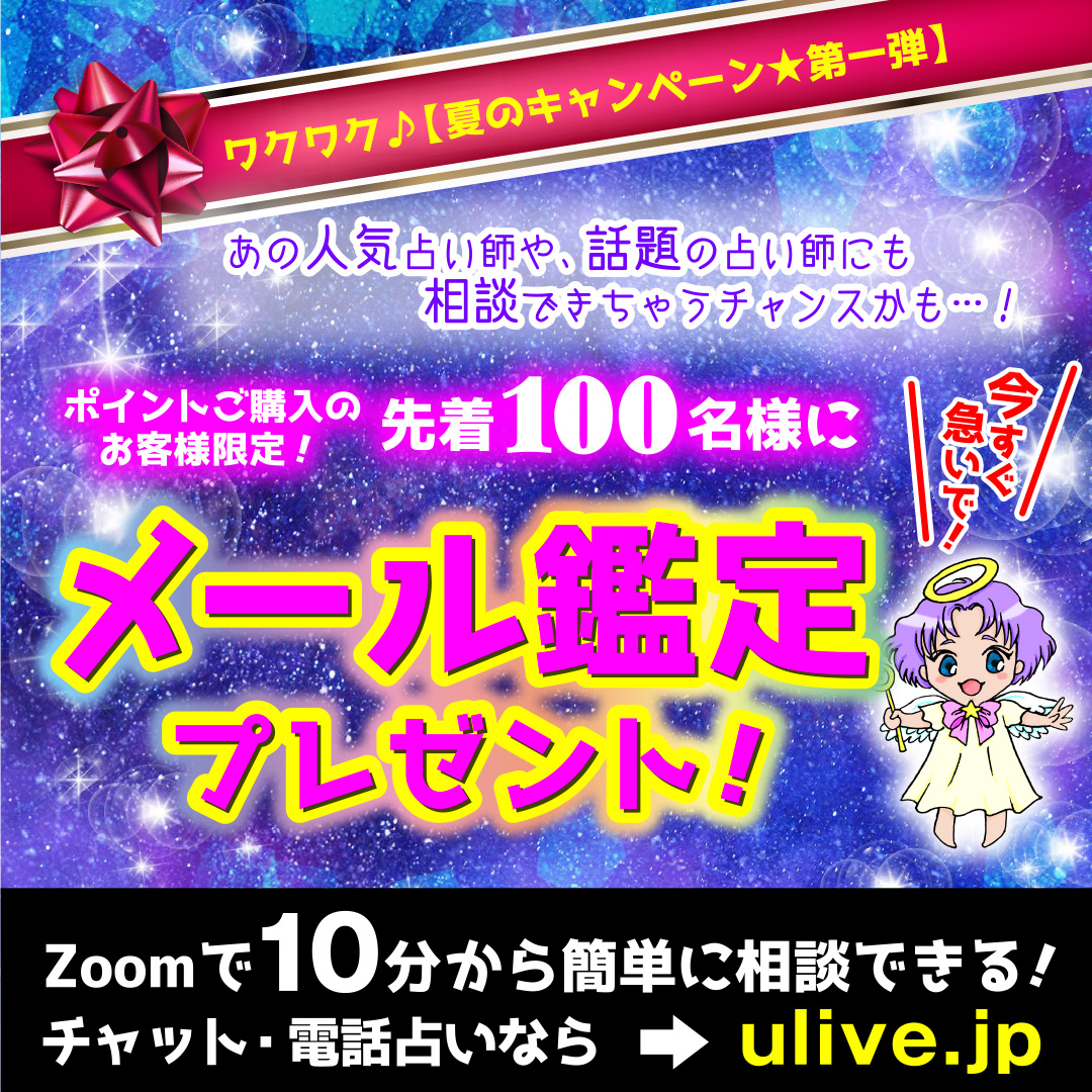 HOME お知らせ 先着100名様、メール鑑定プレゼント!先着100名様、メール鑑定プレゼント!2021.07.28お知らせ 「URANAi LiVE」オンライン鑑定にて、先着100名様に「メール鑑定」を無料でプレゼント! お早めにお申し込み下さい!#uranailive #ウラナイライブ #zoom鑑定 #占い #チャット占い #電話占い Tweet Share RSS この記事のタイトルとURLをコピーするお知らせ 本日の開運アロマ☆2021年7月28日(丁丑) 本日の開運アロマ☆2021年7月29日(戊寅)